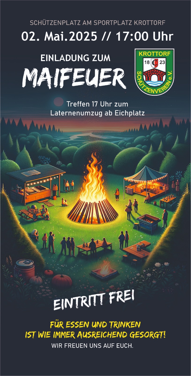 Maifeuer in Krottorf – Ein Fest für die ganze Familie! Am 02. Mai 2025 laden wir euch herzlich zum traditionellen Maifeuer in Krottorf ein! Erlebt einen Abend voller Gemeinschaft, Tradition und guter Stimmung. Programm:• 17:00 Uhr: Start des Laternenumzugs – Treffpunkt ist am Eichplatz. Gemeinsam ziehen wir mit leuchtenden Laternen zum Schützenplatz.• Anschließend: Entzünden des...